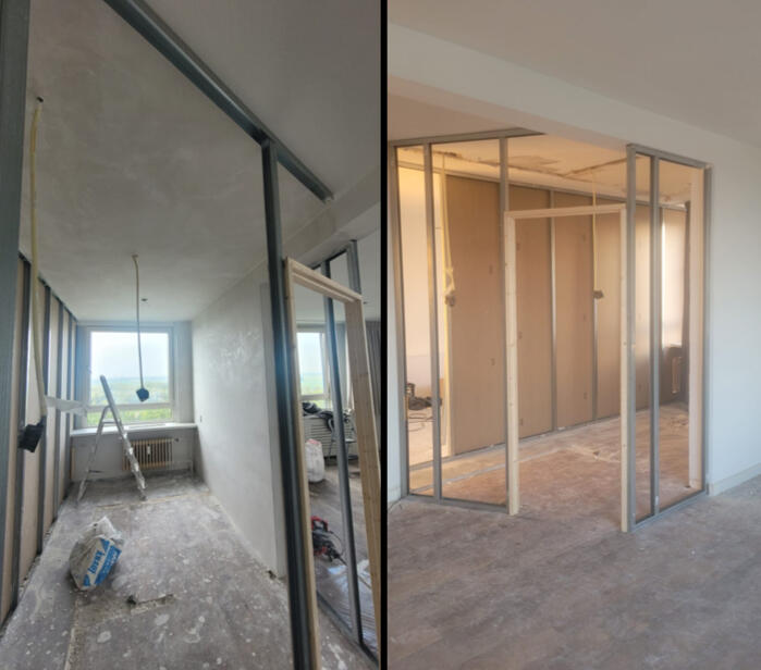 Egaliseren van 800m2 vloeren het leggen van PVC laminaat in 18 woningen.